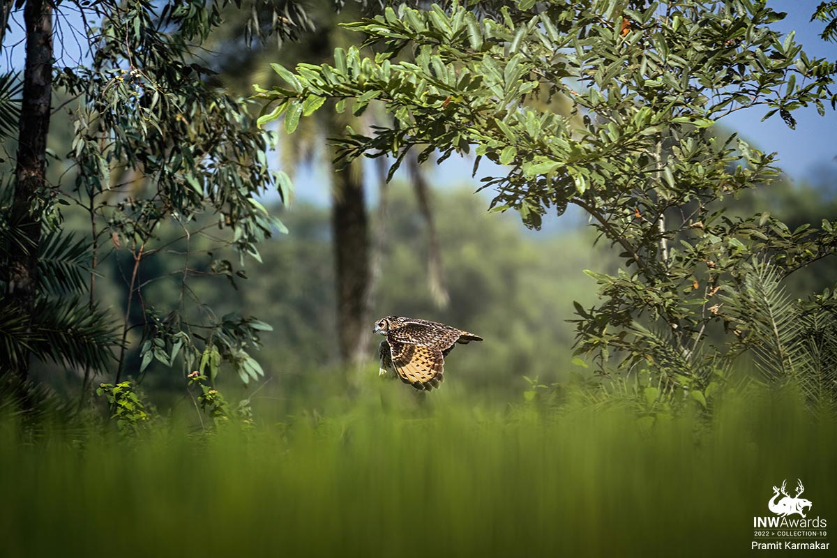 || Ghost of the Jungle || This is a Rock Eagle Owl flying past a village in Purulia, India This image was composed with the subject in between the natural arch made by the trees with a foreground of paddy fields Shot on October 2022