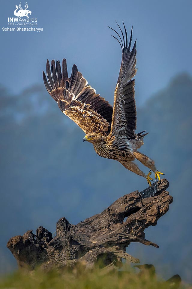 Caption- "THE MAGNIFICENT TAKE-OFF" On a frozen Winter morning, I was in a boat, floating on Tista River, Gajoldoba, West Bengal. My target was to spot any Raptors. During searching through my Binocular, I saw an EASTERN IMPERIAL EAGLE sitting on a 'Dream Perch' & supervising its territory. I started to approach the bird as near as possible, then started shooting with my camera. After some time, The Eagle displayed its majestic wings & took off. I was able to freeze the Grand Take off event, which this shot represents.