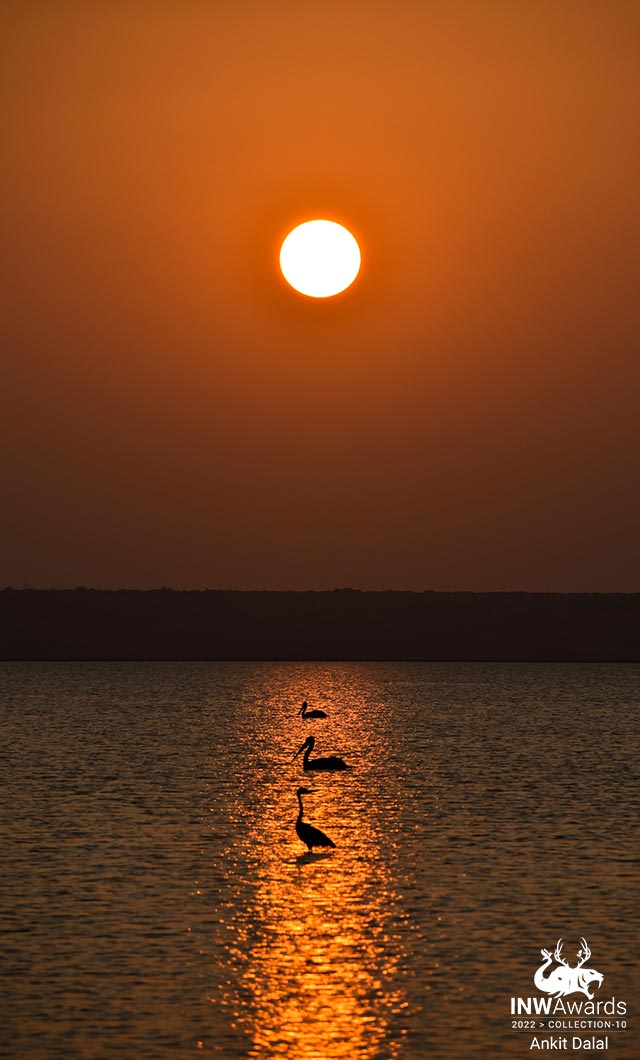 "All in One Frame - Pelicans and Grey Heron in Sunset" Dwarka, Gujarat