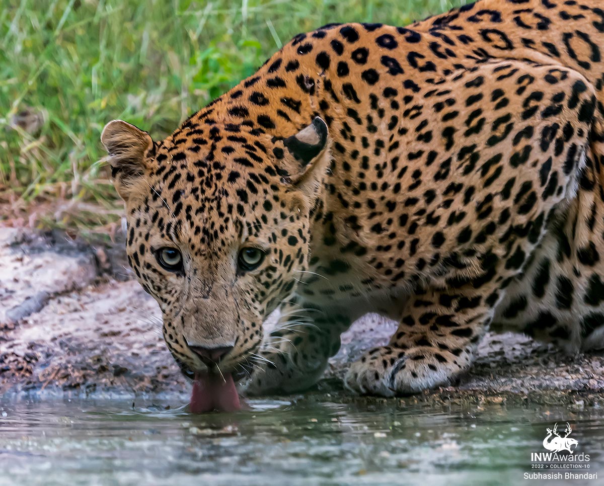 Big Male leopard drinking water in Jhalana wildlife sanctuary Rajasthan at the end of the day