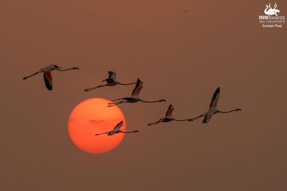 A folks of greater flamingos flying past the setting Sun on a afternoon at Bhigwan bird santcuuary