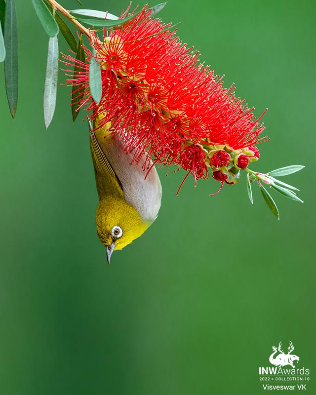 The poser - Indian White Eye: Hyperactive little yellow bird with an off-white belly and white “spectacles.” Found in a wide range of habitats, from mangroves to gardens to forest edge; generally favors more open forested areas.