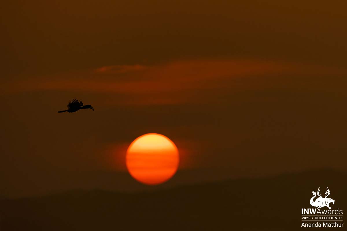 The Sky of Dreams. While photographing the Great Indian Hornbills, noticed that sun was setting behind the valley, and it was a great opportunity to wait and see if a hornbill would pass by the setting sun. Fortunately the exact image materialized, fulfilling a dream shot for me. Photographed at Valparai, Tamil Nadu, October 2022.