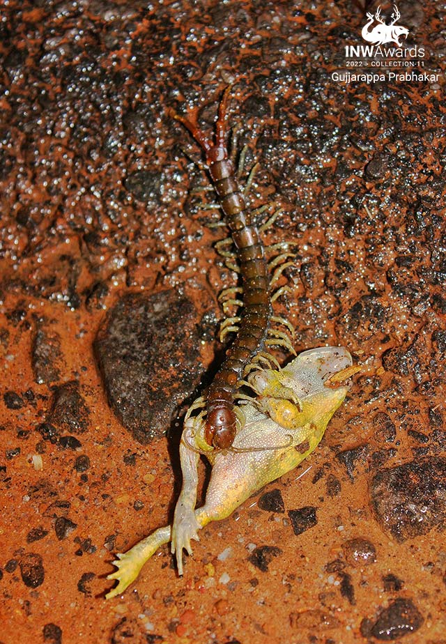 Centipede paralysing the frog with venom and try to feed on it THIRTHAHALLI KARNATAKA CANON 90 D WESTERN GHATS
