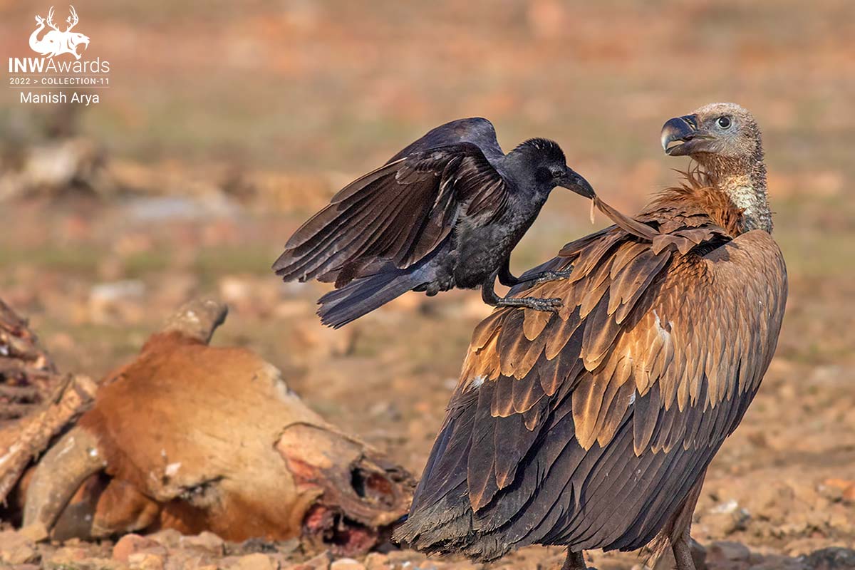 In A Frame :- Griffon vulture V/S Indian jungle crow Scientific name :- Gyps fulvus V/S Corvus culminatus Image Click At Rawatbhata Kota Rajasthan