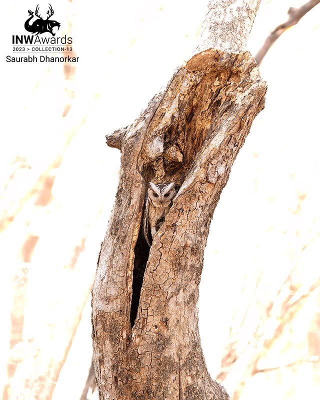This little Scopps Owl was so well camouflaged in the trunk of a dead tree at Ranthambore national Park that it was almost impossible to spot it from the safari vehicle. I opted for this high-key treatment to bring out the details of the tree and the owl - almost of the same color and texture.