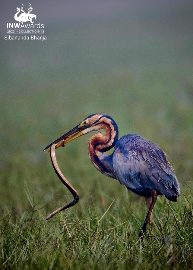 A Purple Heron while killing a Snake as food shot at Manglajodi in Odisha India .