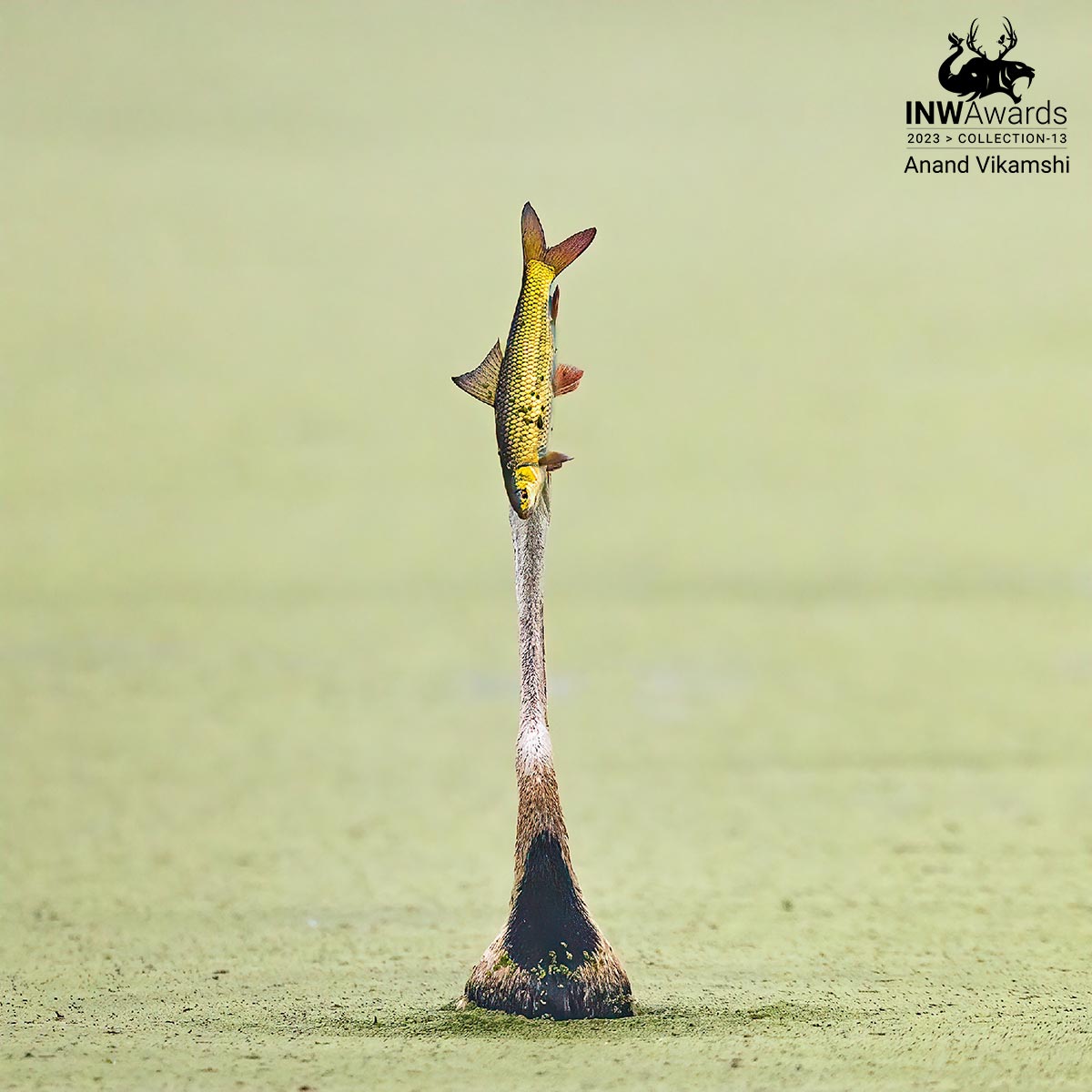 Proudly displaying the catch. A Indian darter fishes for it's favourite meal and comes up with a catch. As it works towards getting the angles right to make that gulp easier, it posed for a moment as if to display its medallion of success. Shot at Bharatpur , India.