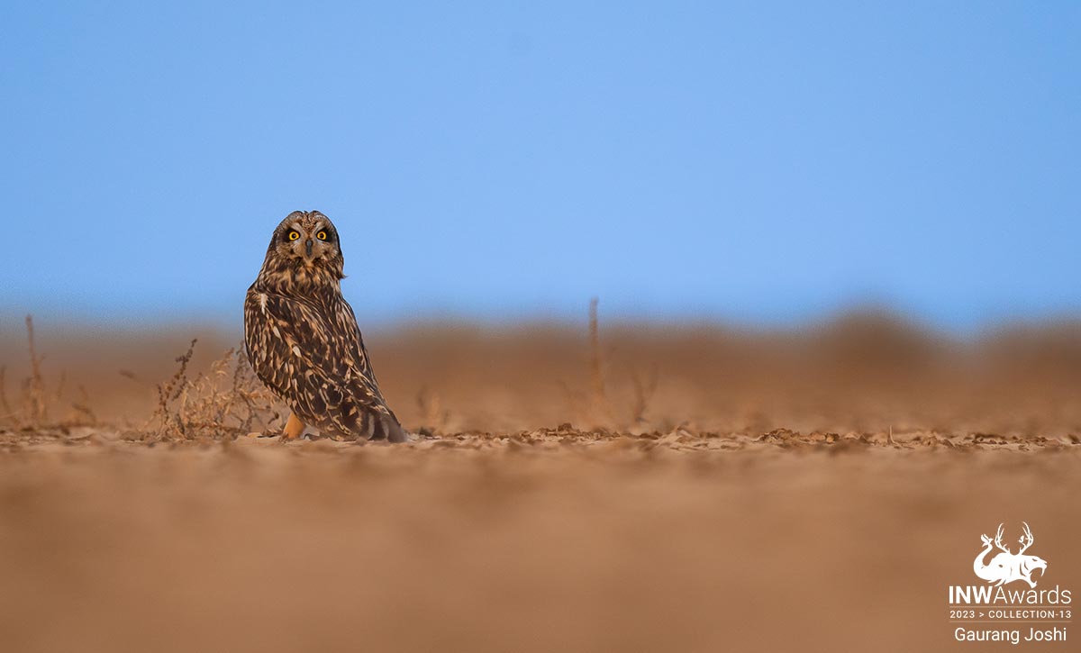 Short-eared Owl (Asio flammeu) is a Medium-sized owl, more frequently seen in the daytime than other owls. Especially active around dawn and dusk, when it flies lazily over open fields or marshes in search of small mammals. The Image is taken at Little Rann of Kutch (LRK) Dec 2022.
