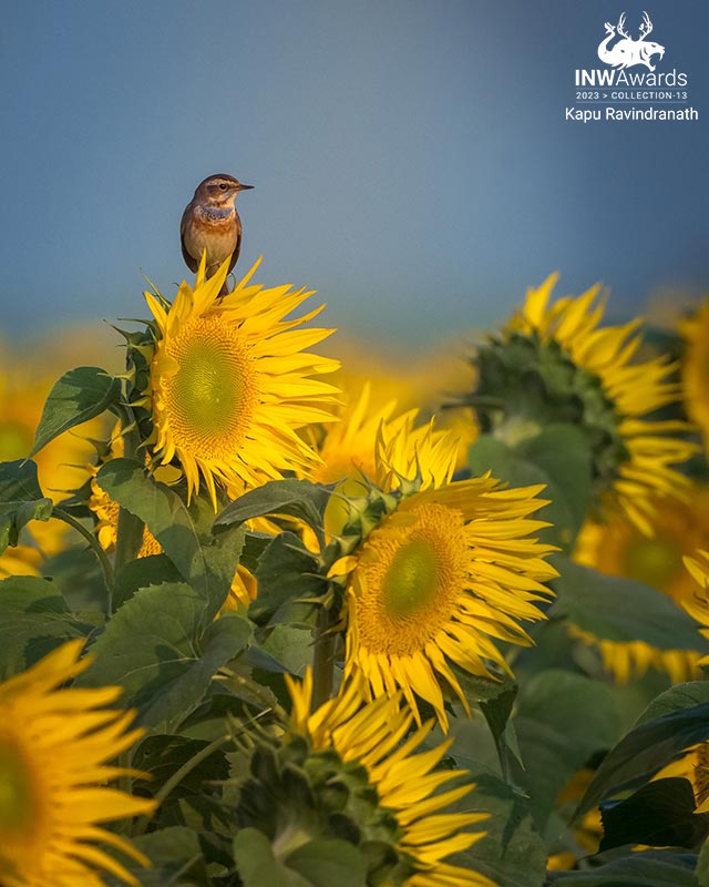Bluethroat and Sunflowers..taken in rural Rajahmundry, Andhra Pradesh when I was travelling along the sunflower fields saw this beauty sitting atop of one of the flowers and the contrast and colour made me take this picture.