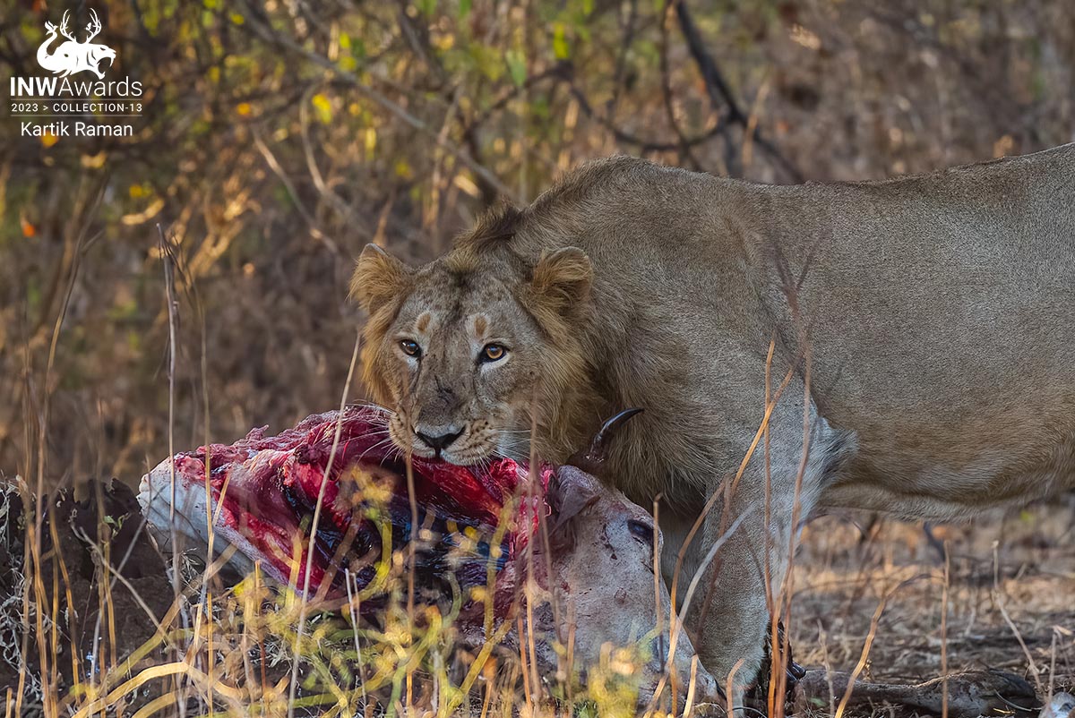 This picture of Asiatic Lion was shot in Sasan Gir on 22nd December, 2020. During safari my guide got tip off that a lion had made fresh kill of cow. When I reached the spot, it was amazing to see the lion trying to pull its prey to take it inside the forest. After sometime another male lion joined and together pulled the prey deep inside. The tribal people have their homes inside Sasan Gir and take their cattle out for grazing. Hence asiatic lions get easy kill in Gir. Shot with Nikon D750, Nikor 200-500 mm.