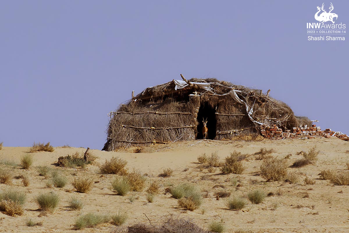 Wildlife in Deserts of Rajasthan. The Chinkara (Indian gazelle), state animal of Rajasthan got shelter in an abandoned hut. A unique habitat shot showing healthy interrelationship between humans and the wildlife.