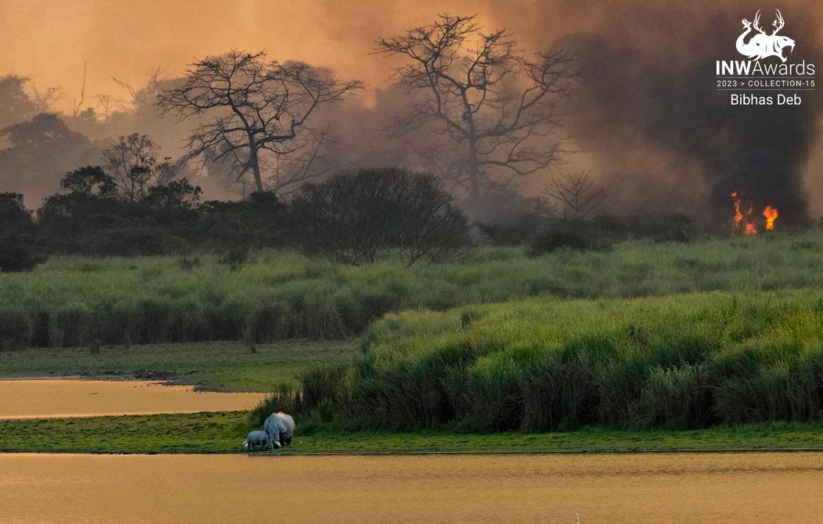I took this photograph from Kaziranga National Park, Assam. During that time, a forest fire occurred, I think this may burn primarily as a surface fire, spreading along the ground as the surface litter (senescent leaves and twigs and dry grasses, etc) on the forest floor and is engulfed by the spreading flames. Or it may occur naturally. Certain plants and animals have evolved to depend on periodic wildfires for ecological balance. I see one Mother Rhino and her child eating grass without any fear.