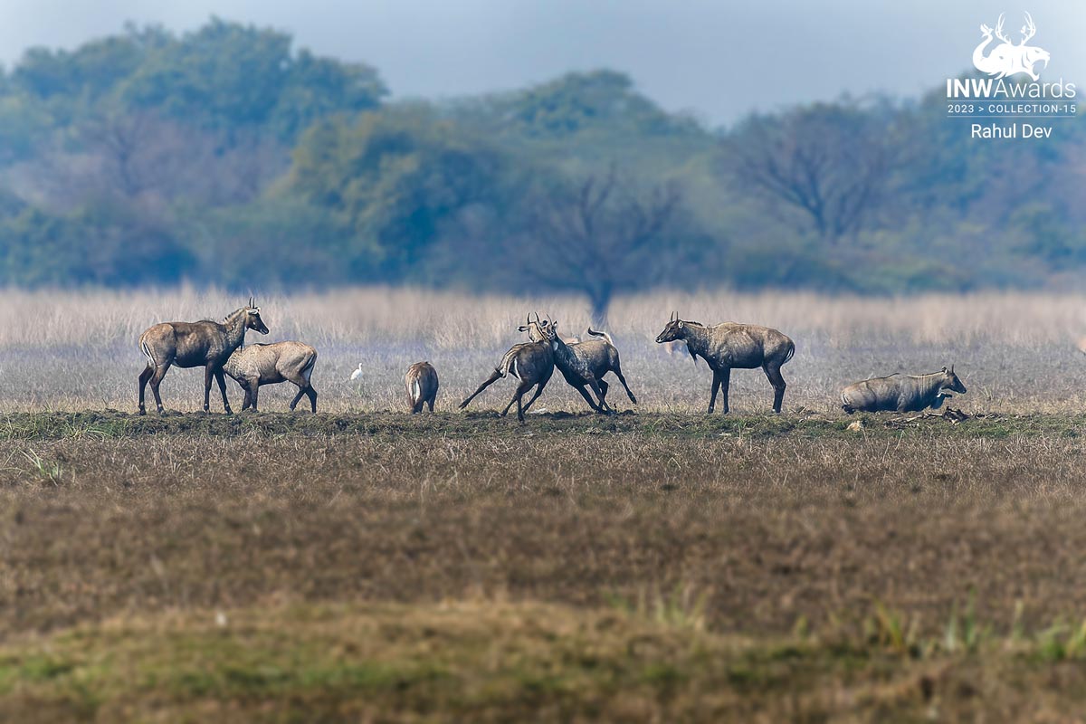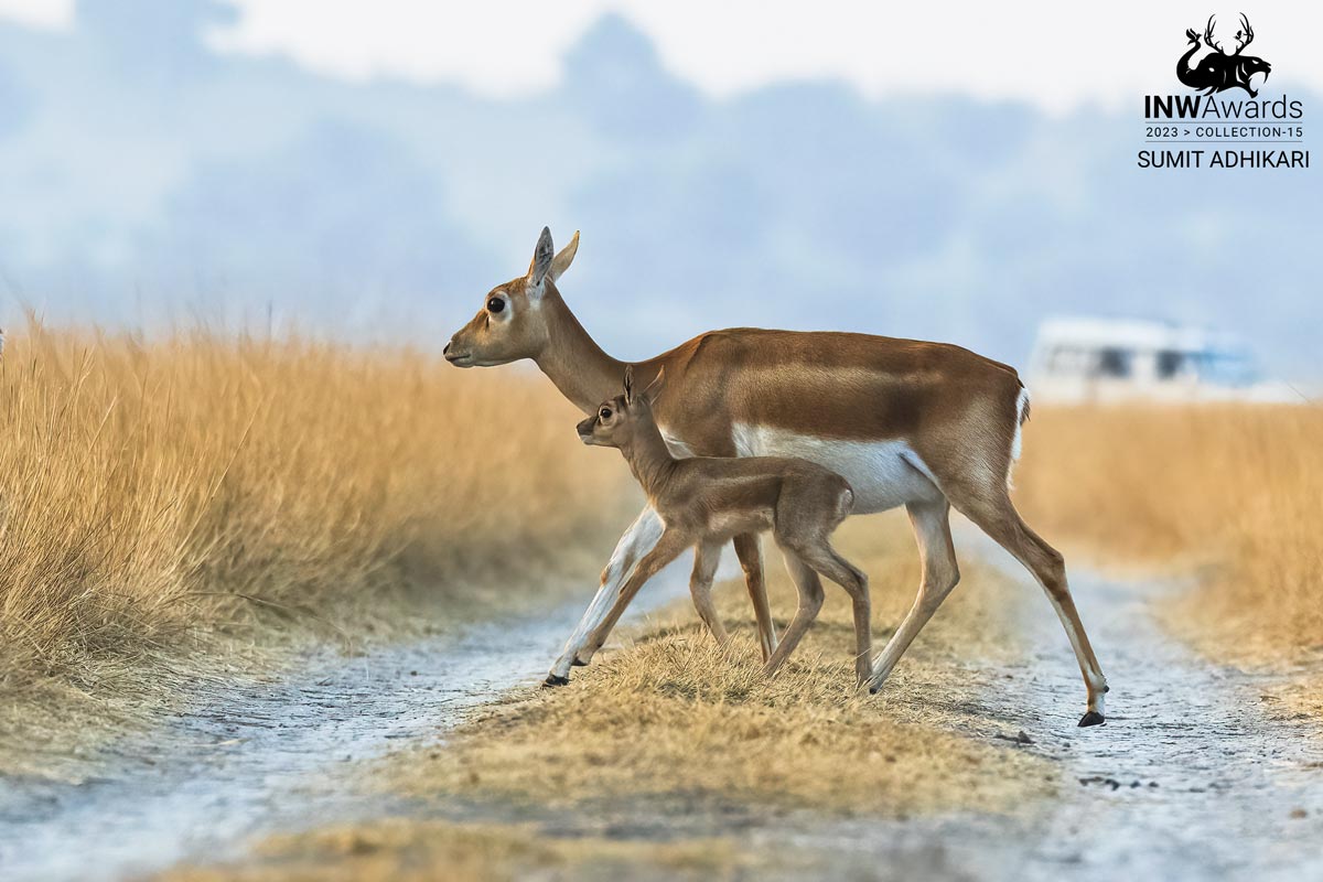 A Blackbuck fawn crossing the road carefully with mother in early morning. This shot was taken at Tal chappar sanctuary, Rajasthan dec 2022. I was patiently waiting at a distance as the herd of blackbuck was crossing the road and then suddenly got opportunity to shoot this beautiful moment of fawn crossing the road with mother with some quick shutter.