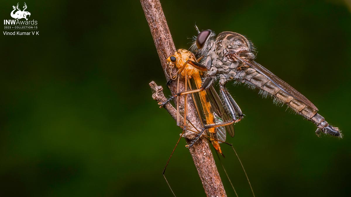 Robberfly!! This aerial predator is a terrific hunter. This time I saw it lively hunting this cane fly. After hunting it rested around an hour with the prey on a perch and sucked the juice out if it completely.