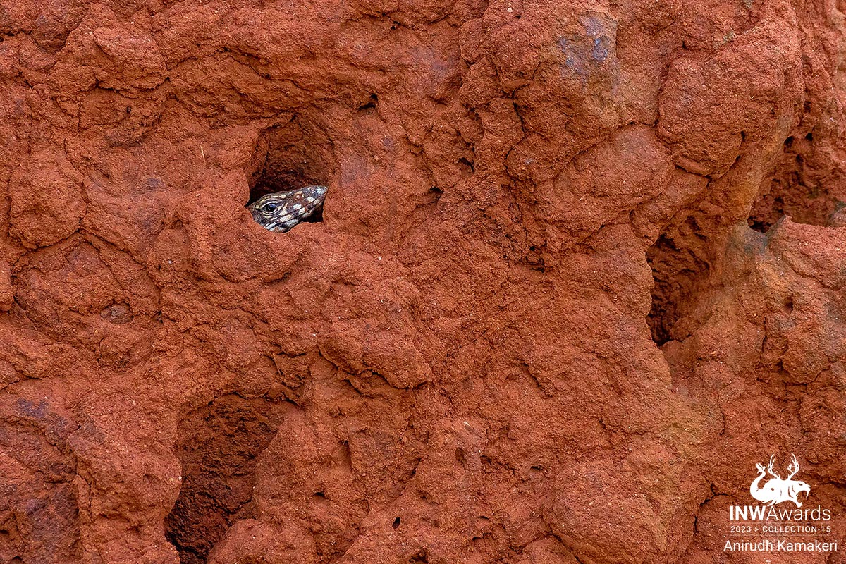Peek-a-boo: A curious Monitor lizard peeking out of the burrow .Earlier , a Painted Francolin was displaying on top of this ant mound ,but suddenly the bird flew away , on a closer look we were able to see that this monitor lizard was peeping out of the burrow
