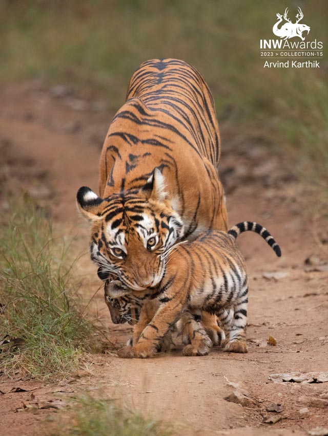 Tiger image - Location - Bandipur Tiger Reserve Write up - A Moment where i lost myself and was not able to believe whats happening in front of me, a mother trying to carry the cub in her mouth and the cub not willing to get carried Caption : Eyes of the mother