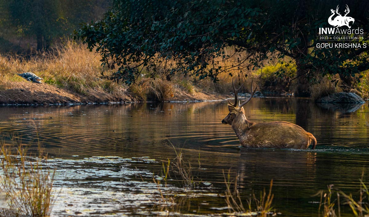 Walking to the jaws of death. Sambar deer taking his chances against a baby crocodile in Ranthambore.