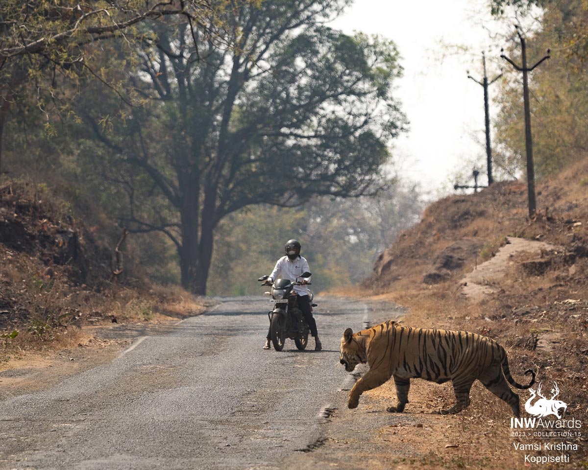 Unexpected Encounter The piercing eyes of Tiger scanning the surroundings before crossing the road. On sudden appearance of the tiger, the bike driver slams on brake and switches off engine and waited still as the tiger crossed