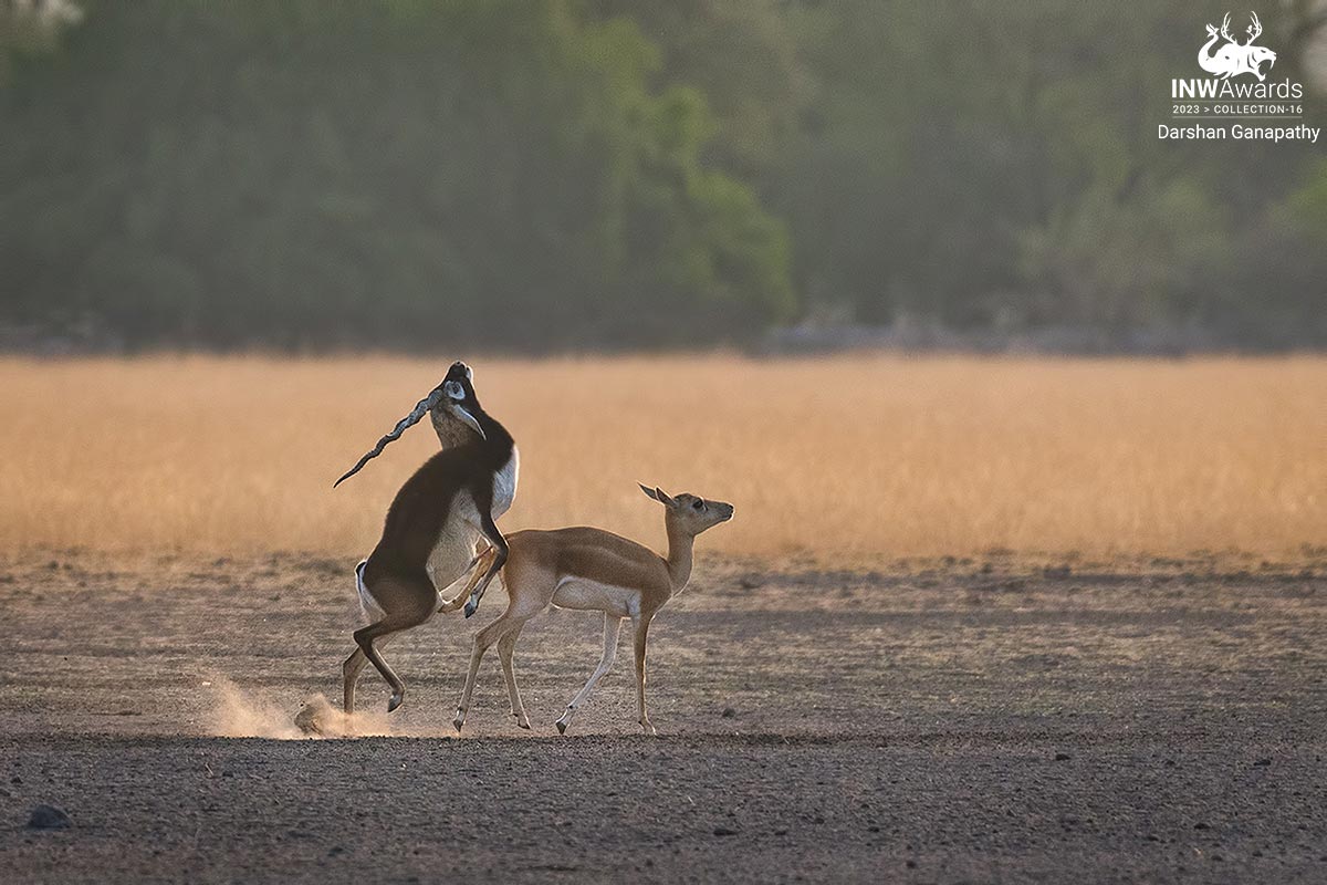 Blackbuck is also known as Indian antelope. It inhabitats grassy plains and lightly foresed areas. The herd of blackbuck consists of an adult male and numerous female. The female blackbucks are very caring and they take care of their young ones with utmost care. This image was shot in Talchapar India.