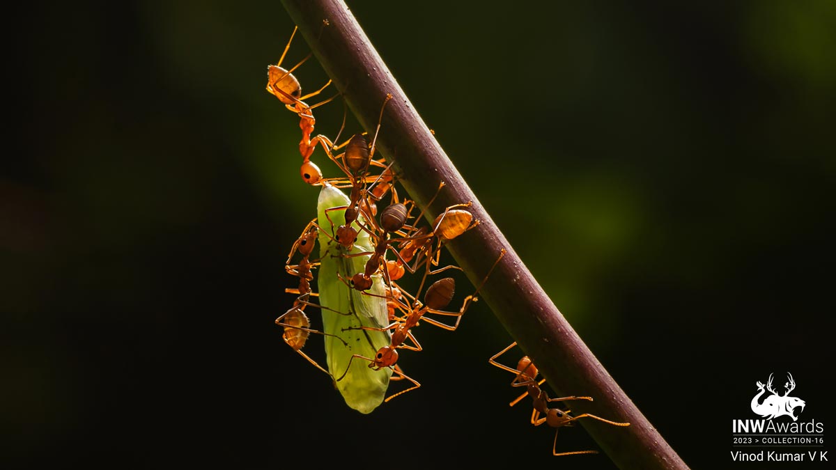 Weaver Ants lives in a colony. They always works together as a team. Here in the picture we can see a team of weaver ants carrying a dead pupa of a butterfly.