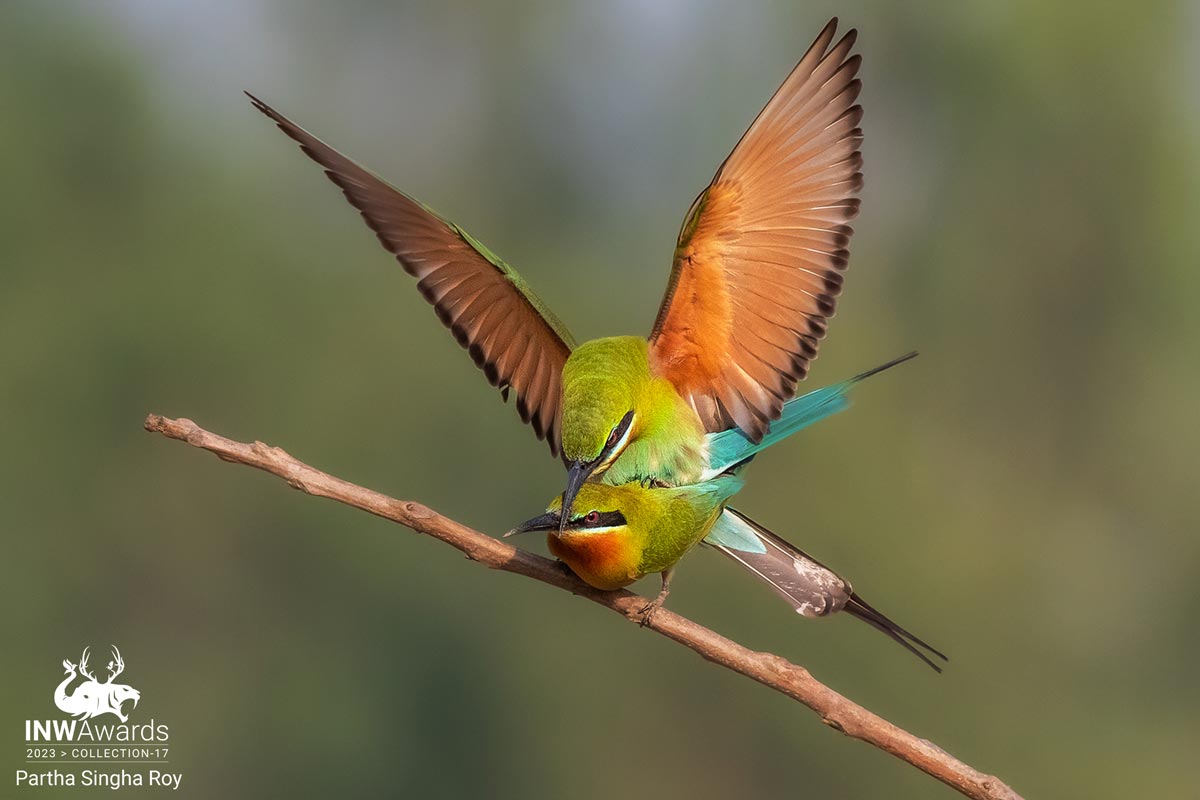 "Blue tailed Bee Eater mating" Patience and perseverance always pays. Been waiting for 3 days in scorching heat for this moment in perfect background and light conditions. Thanks to mother nature.