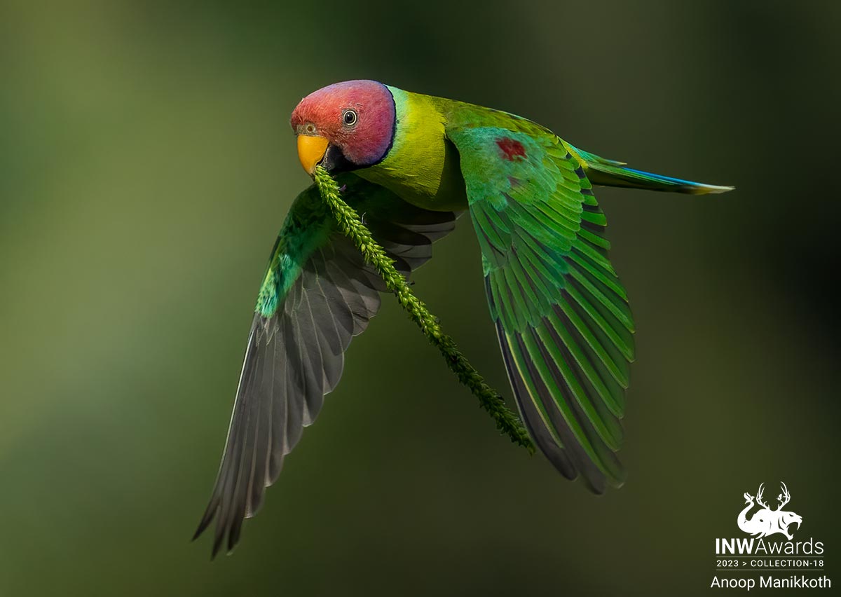 The true shade of Plum! Plum headed parakeet flying back to perch after skillfully fetching it's meal! Shot at Malappuram, Kerala