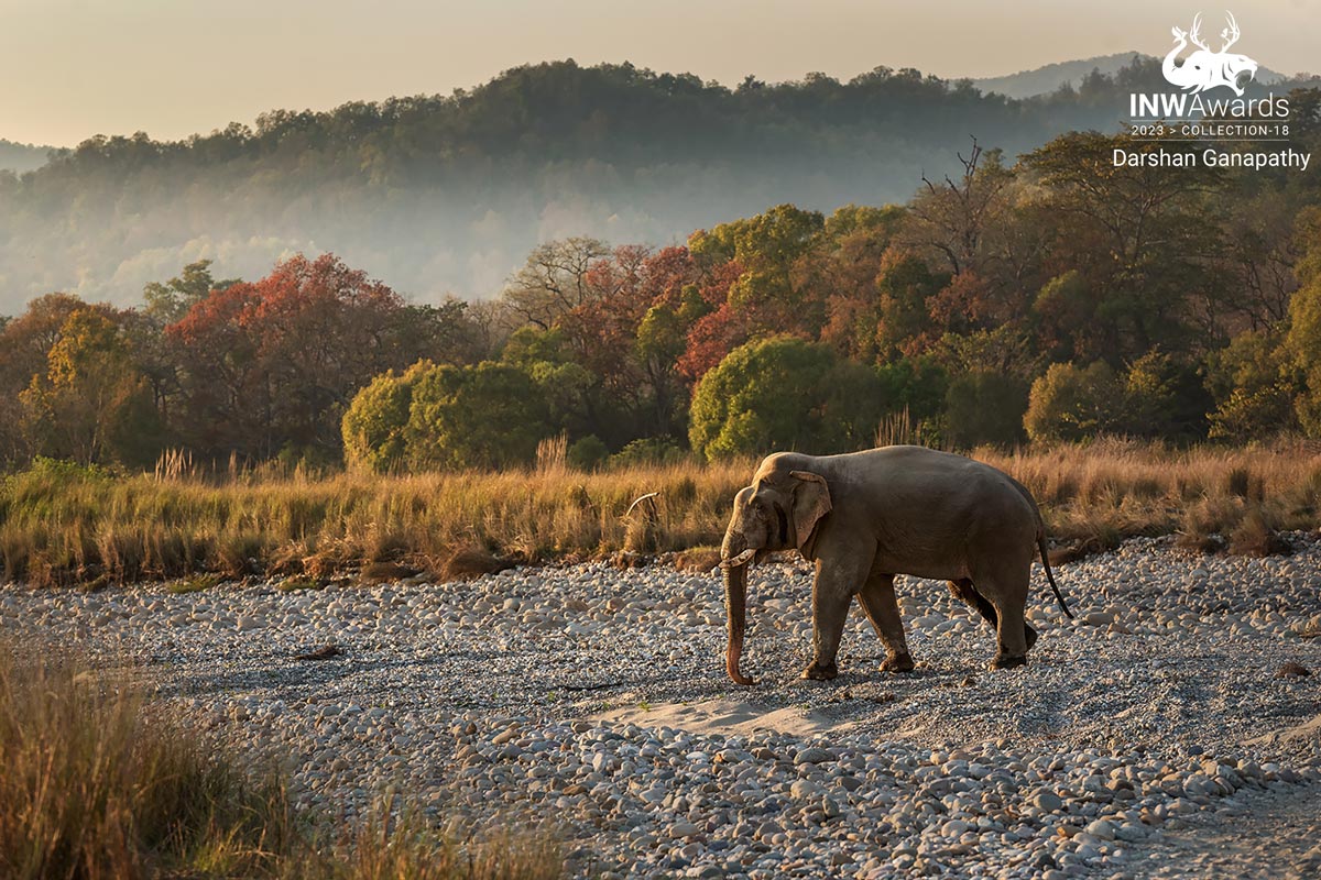 Elelphants are the largest of Land Mammals. Corbett National Park is a part of migratory population that lives in Rajaji National Park. Adult males usually travel alone and associate with female herds for mating. The beauty of Corbet with the Kusum trees is shown in this image.