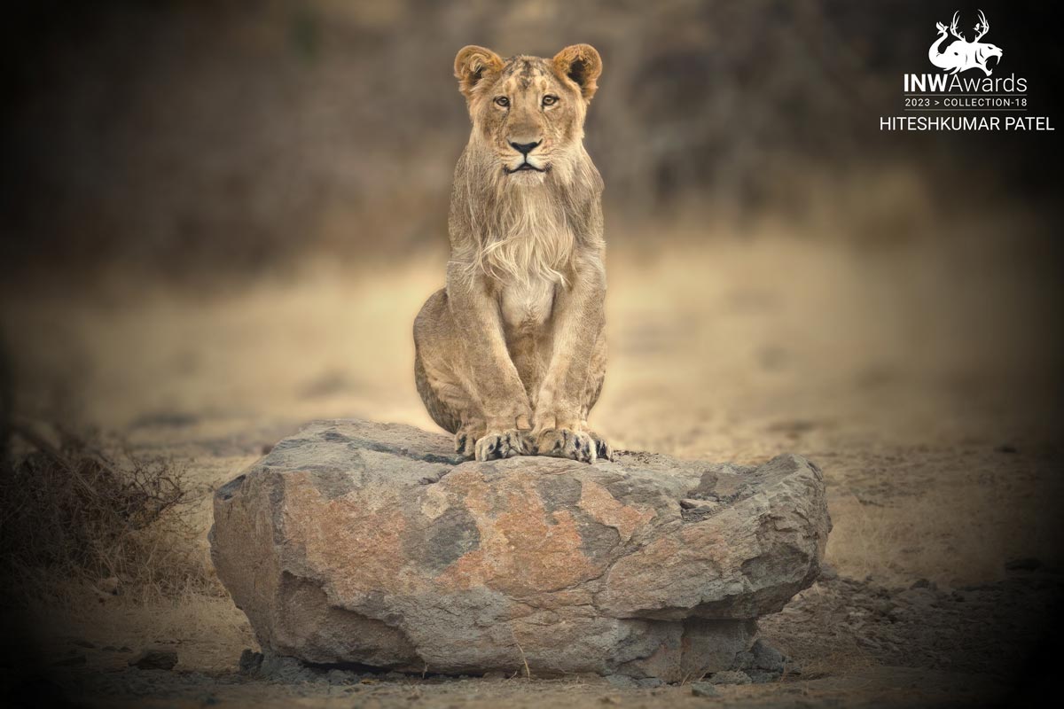 "Head-on Majesty: Lion Cub's Impressive Pose" This captivating photograph captures a breathtaking moment at Ambardi Safari Park in Amreli. In this remarkable shot, a young lion cub confidently sits on a rock, presenting an awe-inspiring head-on pose. With piercing eyes and a commanding presence, the cub exudes both innocence and the promise of future strength. The cub's golden fur blends harmoniously with the surrounding atmosphere, adding a touch of serenity to the scene. This image beautifully portrays the untamed beauty and raw power of these majestic creatures, inviting viewers to appreciate the wonders of nature and the circle of life.