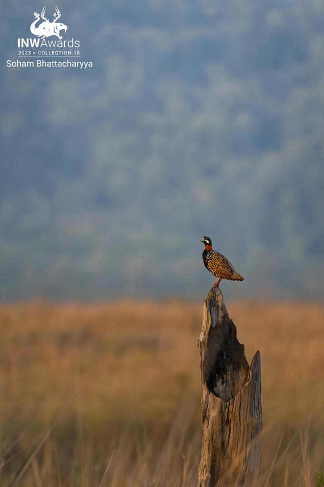 THE CALL OF THE WILD!! This is a photograph of one of the most common & charming pheasant species, BLACK FRANCOLIN, which, in this image, is calling sweetly from the most beautiful grassland of India named as Dhikala, Corbett National Park.
