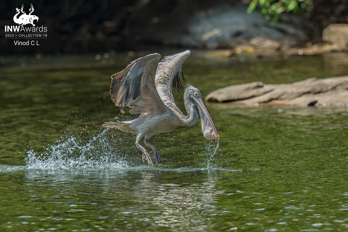 During the nesting season the Spot Billed Pelicans at Renganathittu in Karnataka fly low and parallel to the water body to scoop water without landing in the river to avoid the numerous crocodiles in the water. Tracking them and photographing them from a boat is not easy. After many failed attempts I managed to get one decent shot.