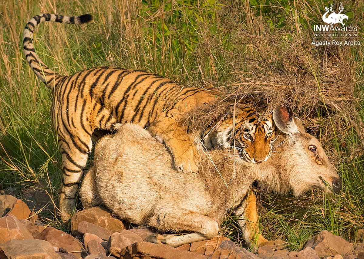 Tigress T111, hunting down a huge sambhar deer in Ranthambhore, zone 4 in the month of April, 2023