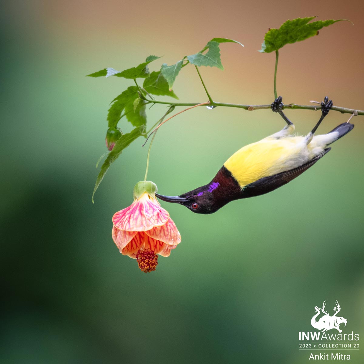 A hungry male purple-rumped sunbird feeding on a lantern hibiscus flower.