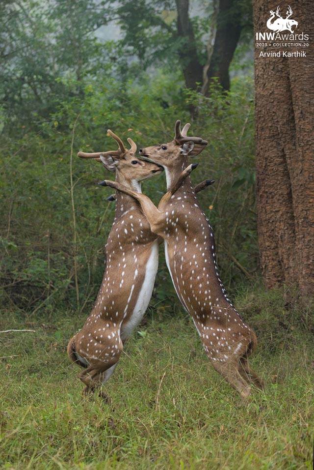 Two spotted deers wrestle on a winter morning Location : Nagarahole Coorg side