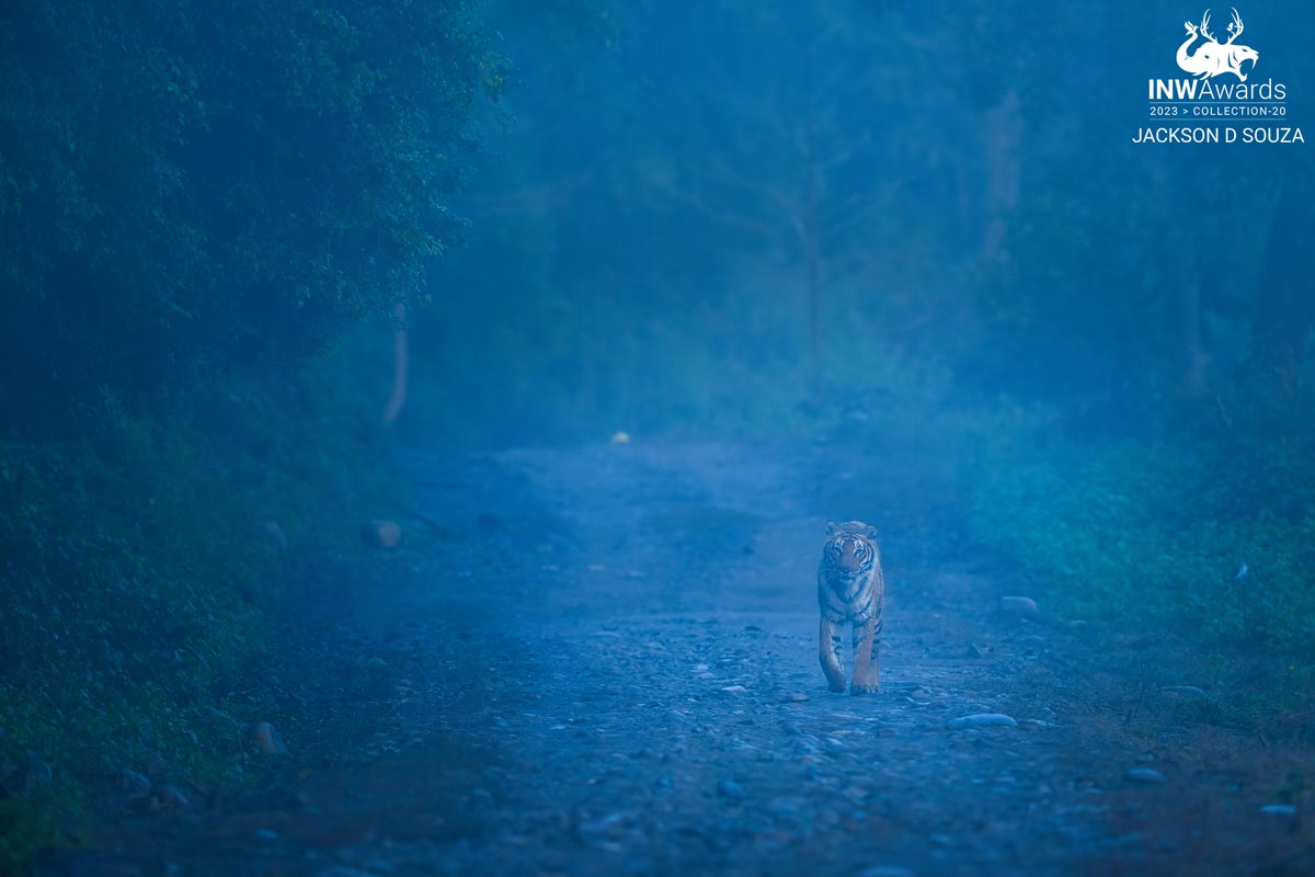 Tigress roams through the morning mist in Ethereal Blue Light - Jim Corbet, Uttarakhand.
