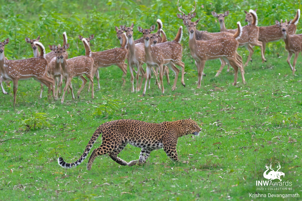 This was a moment of beauty and peace caught in the season of monsoon; in Bandipur National Park. I feel it's a great opportunity to capture both the herd of deer and a big cat in a single frame. They evidence the co- existence of peace and fear