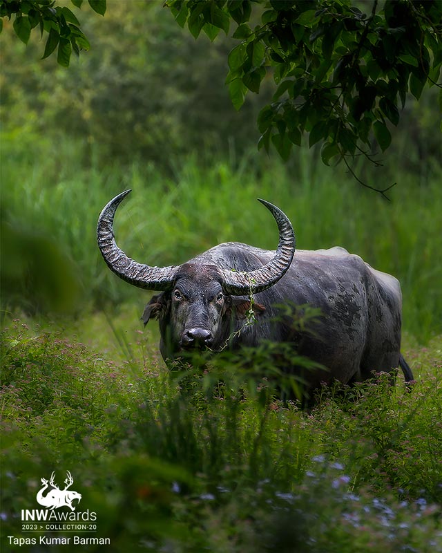 Water Buffalo Kaziranga National park, Assam, India April, 2023. Wandering at the dense forest of kaziranga this fellow was busy on eating grass. Subsequently she realised our presence and typically started to stare reflecting his protective nature to dare. A loop of grass hanging from her horn like an ornament made this fellow more beautiful.