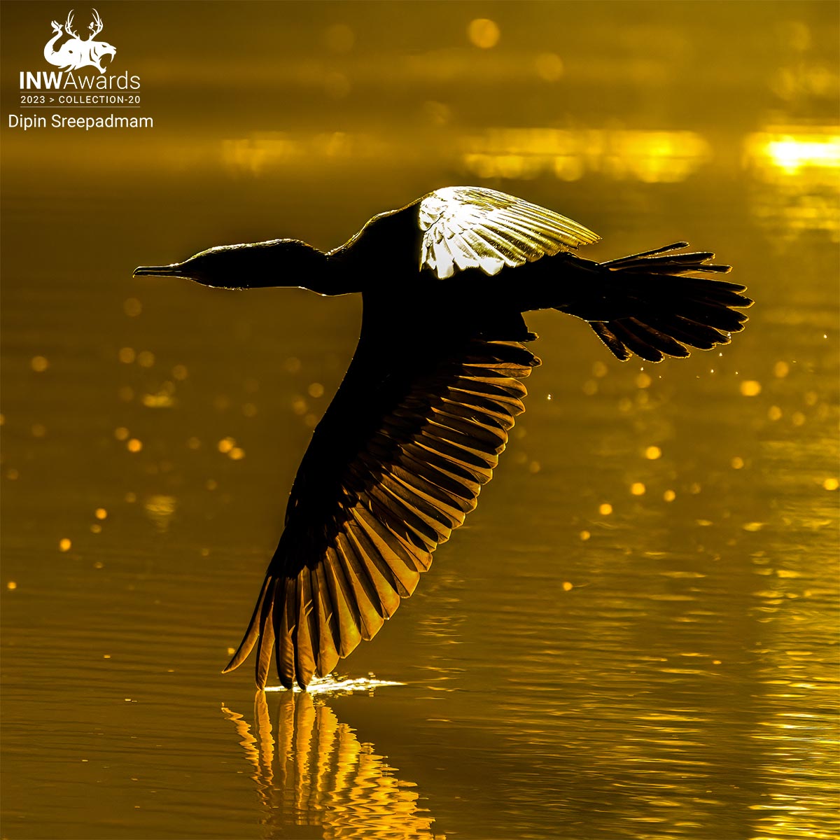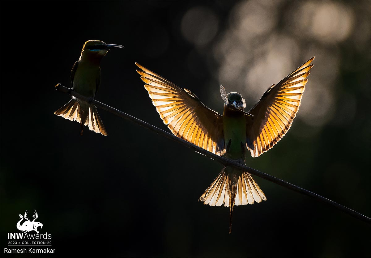 Wings like fire. Shooting bee-eaters in action is definitely a challenging job. In the given frame which attracted me are the filtered golden light through the wings of the birds and the bee, their relative position on the points of interest in the frame and the unique background created by the Bokeh of lights filtering through the distant pinholes created by the vegetation far behind.