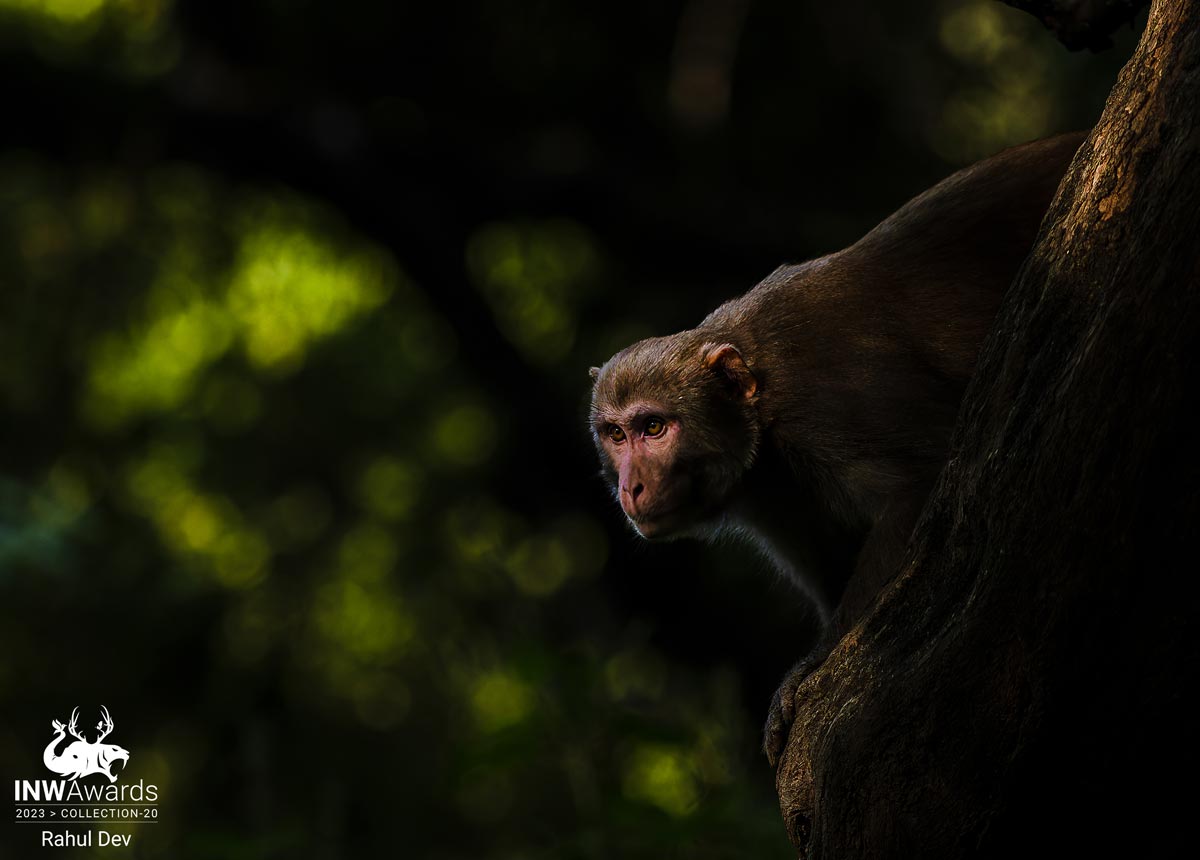 Keoladeo National Park is packed with beautiful backgrounds. A male Indian macaque asserts dominance with an angry mood, while sunlight filters through the tree canopy.