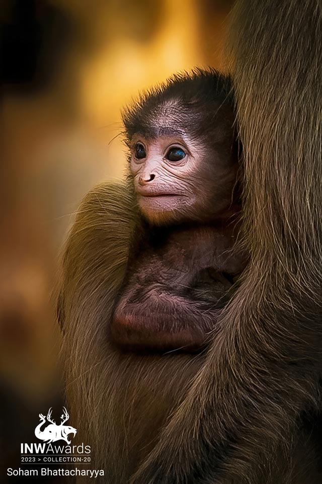 "IN THE PUREST PLACE ON THE EARTH" The Grey Langur is one of the most unique animals found in the forest. I, or any wildlife photographer, consider it a favorite subject for photography. The main reason is their extraordinary variety of expressions that amazed us all the time. This picture was taken during my recent visit to Kanha National Park, in which, A Cute & innocent langur infant is looking around with curious eyes from the lap of its mother. The beautiful expression of the langur baby made me capture the tender moment.
