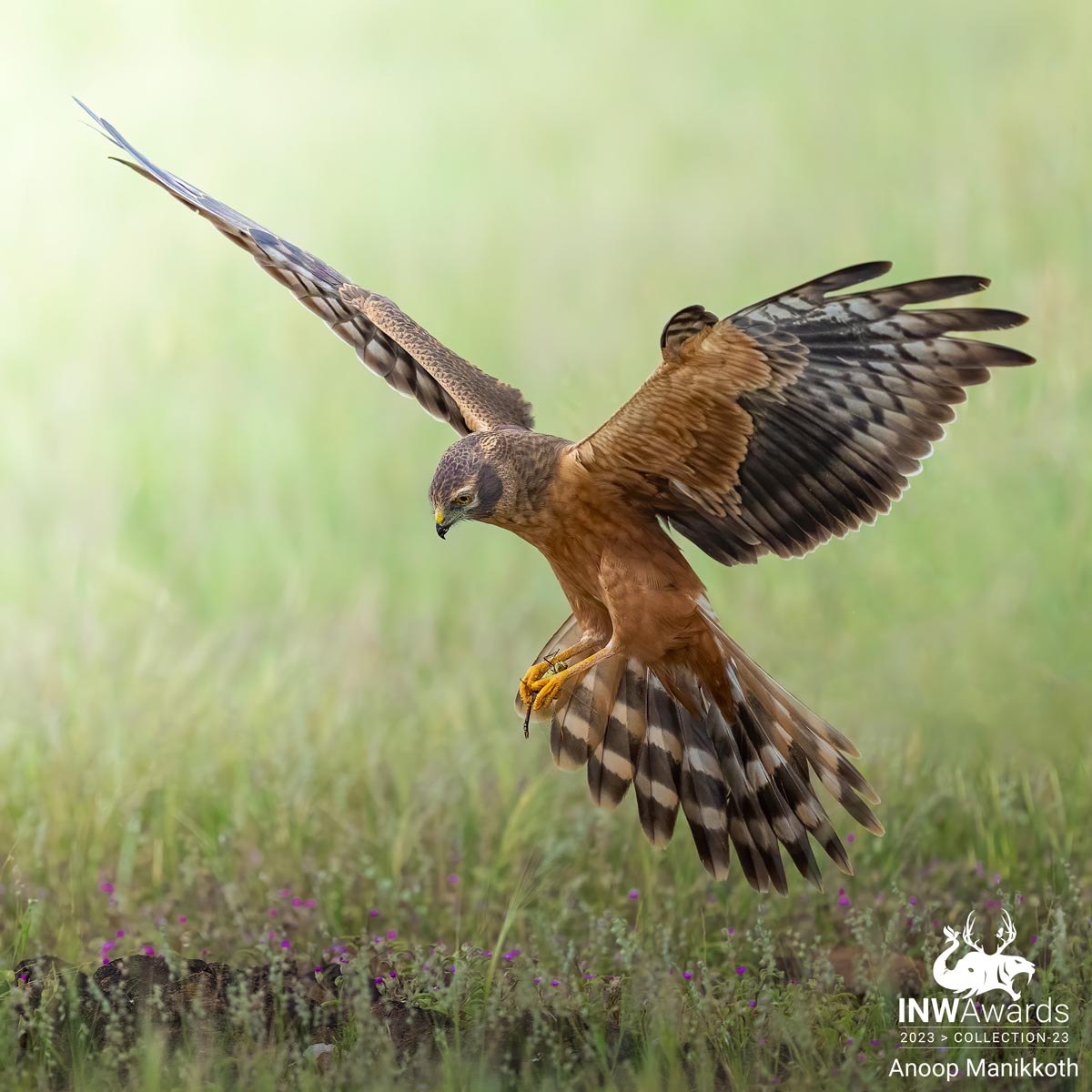 Shot at Bhigwan, the female harrier is landing with a dragonfly kill