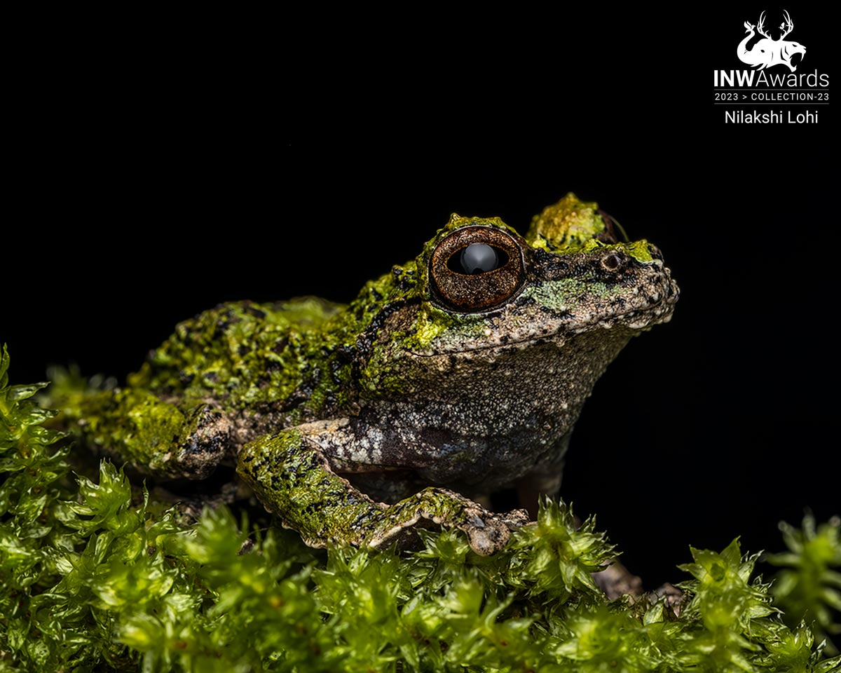 The Water Drop Bush Frog a.k.a Raorchestes nerostagona, an endemic, endangered species of Western Ghats The calls made by these dwellers of the tree canopy is like a loud, echoing rain-drop falling into a bucket of water, repeating about every 3 to 4 seconds. Also known as ..The Kalpetta Yellow Bush Frog or lichen bush frog, it has an interesting body pattern which seems like lichen growing on it. These are one of the most difficult to spot species bcoz of their pattern and also because they live on high canopies.
