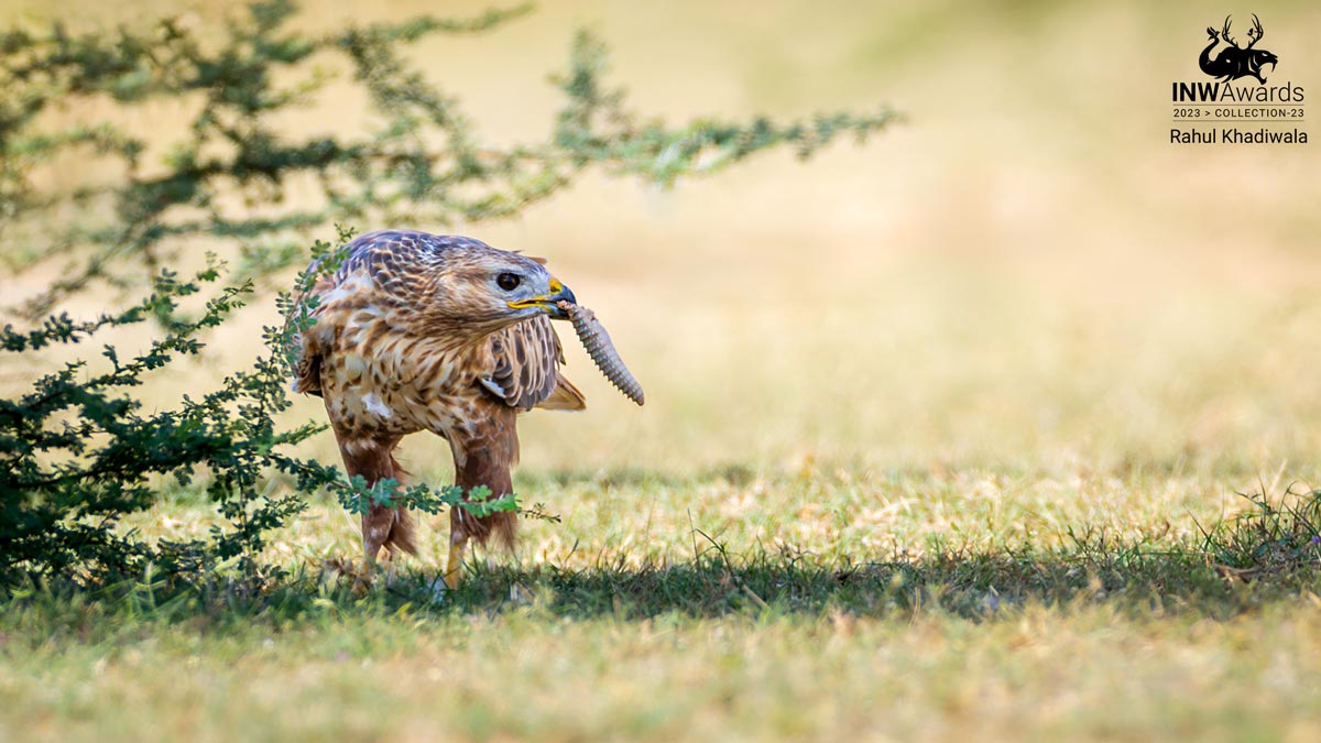 Tal Chappar Sanctuary is a hot spot for raptor action and winter migratory birds. Fascinating action unfolds when different species of buzzards and eagles feed on Spiny Tailed Lizards. In this shot, the Long Legged Buzzard devours a Spiny Tailed Lizard's tail. Loc: Tal Chappar Wildlife Sanctuary.