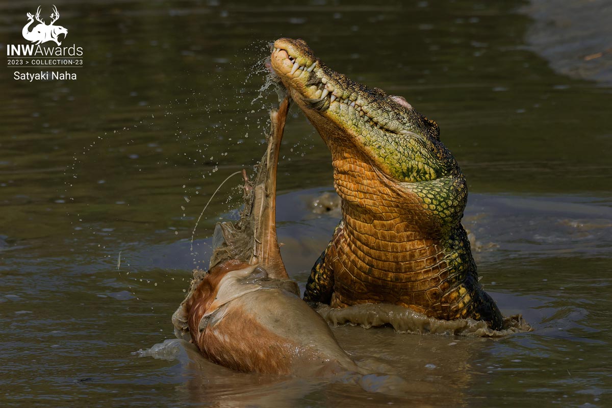 Saltwater crocodile is the deadliest crocodile in the earth.The saltwater crocodile has the greatest bite force of all animals with it measuring at 3,700 psi. Sundarban is the home of this beast . In my last visit of Sundarban i.e 14th November I saw the live hunting of crocodile. When two deer were crossing a canel this crocodile attacked and drown one deer in the water. After that rolling and rolling happened and I got this rarest moment of Sundarban.