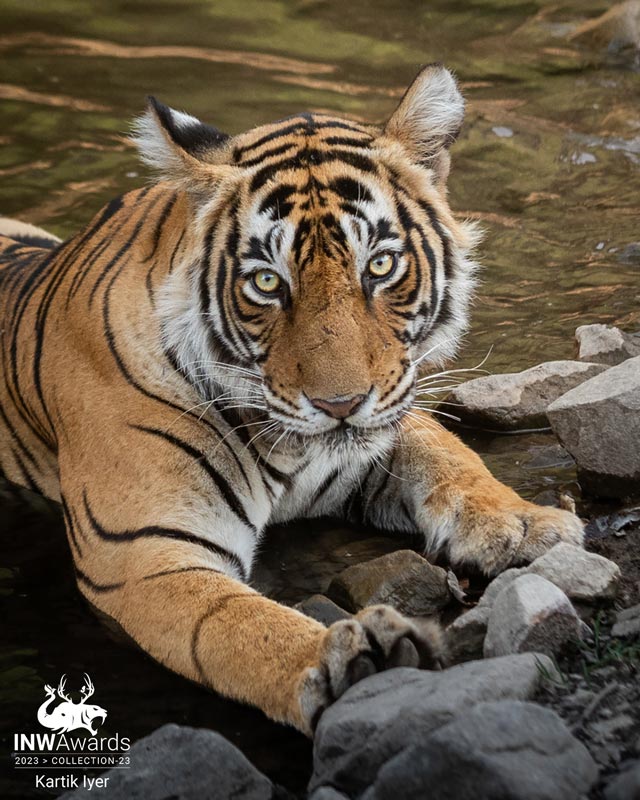 Eye contact with Noorie. Tigers love lounging in water on hot summer afternoons. This was one such occasion when Noorie entered her pool and looked straight back at us