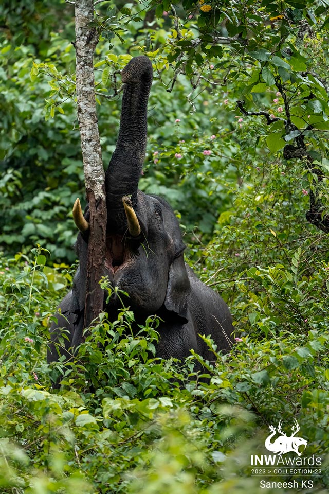 Bandipur Tiger Reserve, September 2023, Wild elephant trying to take the tree branches for food.