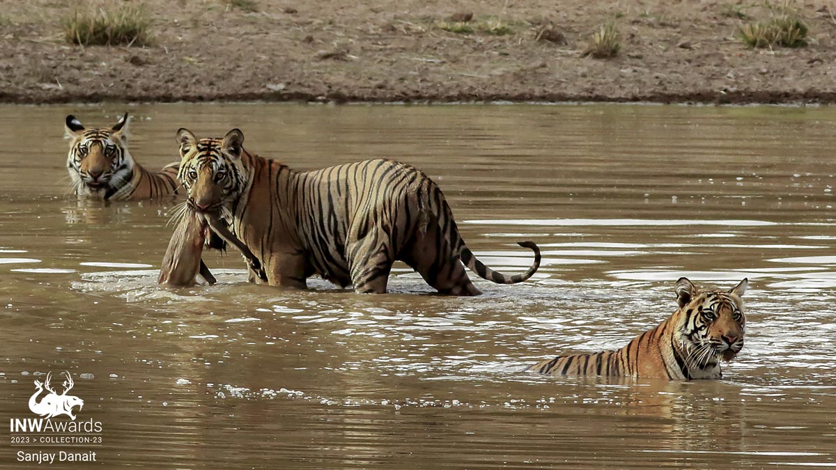 'Awesome Threesome!' Three sub-adult tigers with a Gray Langur kill displaying their prized trophy in a forest waterhole. Location: Bandhavgarh National Park, India. Canon 7D Mark ll with EF 300/F4 lens.