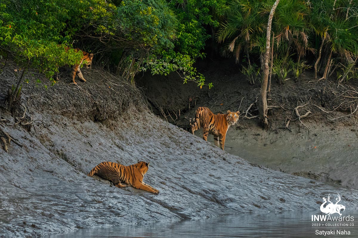 .... Well, is Durga puja celebrated in the Sundarbans? ....yes it is. It takes place in the village, but the biggest puja is in the forest. ... durga puja in the forest??? ... No Durga Puja fair is sitting in the forest, tigers come out to see the fair during Puja. Talking with a photographer friend on the day of Chaturthi was funny. Along with the clock was counting Shasthi, Mother's "Bodhan" and the beginning of my Sundarbans "Sharadia". When I left Kolkata on the panchami, I kept saying to myself to the beat of the curtain - Mother and cubs - Mother and cubs. But Mother Durga knows what will happen. Maha Shasthi:- Woke up at quarter to four in the morning to the Roar of the tiger, although the Roar was in a dream, the time on the mobile was showing 3.45am. Even though I woke up so early, the sleep in my eyes has disappeared somewhere. 4.30am boat starts moving, somewhere in the distance the song "Bajlo Tomar Alo Benu" is playing on the microphone. As the light northern wind is blowing me and my guide Golok started our as usual funny jokes. Today Golok will see the kata male, he started the puja with him last year. However, I will visit Phuleshwari area while going. Phuleswari is a very weak spot for me. Agreed... As we entered the forest, we were welcomed by the osprey. We looked pretty like ospreys in the morning sun. I left the area of Phuleswari and reached the area of Kata Male. As I entered the small creek, I saw fresh footprints. Immediately the boat was rotated, It seems that our target will be met today... Next canal... the tiger is gone, left behind us... Mahadev da go to the next channel... Tiger Tiger... Tiger is coming down... Tanmoy Da, Prosenjit take pictures... frame on the grass, golden light. After crossing one by one canal, we are waiting at the last crossing point. By now, all the boats have arrived, everyone is waiting. In the afternoon, the tiger doesn't come out anymore... Golak: Dada, let's look along the bank, the tide has fallen, the inside can be seen, if he is lying in the forest. As the boat turned its head and came close to the shore, I saw two tigers lying inside. Oh! its Tigress Boro Maa and her cubs... There is another child on that side... did you see dada... Golok whispered That's going up... Go to the next channel... Go away Mahadev da... Three will come down together... They are coming down. The shutter started... children's games followed... Perhaps this is the first documentation of such an adorable moment of two tiger cubs in the Indian Sundarbans... The feeling of this wonderful moment in front of the eyes is...BODHON mother's bodhon, "Jai Maa Durga" was uttered in mind.