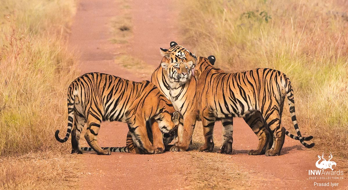Perfect family frame Anyone's dream shot to get a tiger family right in front of you. Babli and her three cubs in a single frame. A dream come true moment when Babli along with her three cubs gave us a good 40 mins of family moment. You can see the mother licking her three cubs. The cubs rushed to their mother the moment they saw her. As they say perfect family moment.