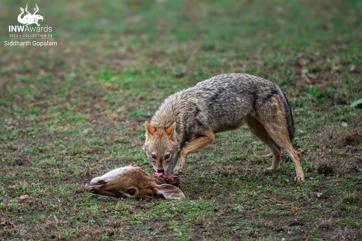 Witnessing nature's raw beauty - a Golden Jackal devouring a Spotted Deer's head. A truly awe-inspiring sight from Pench National Park - Turia Gate.